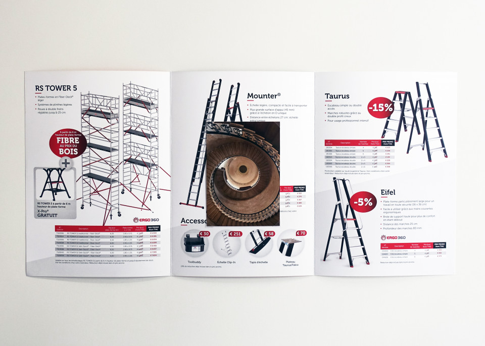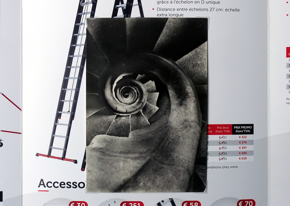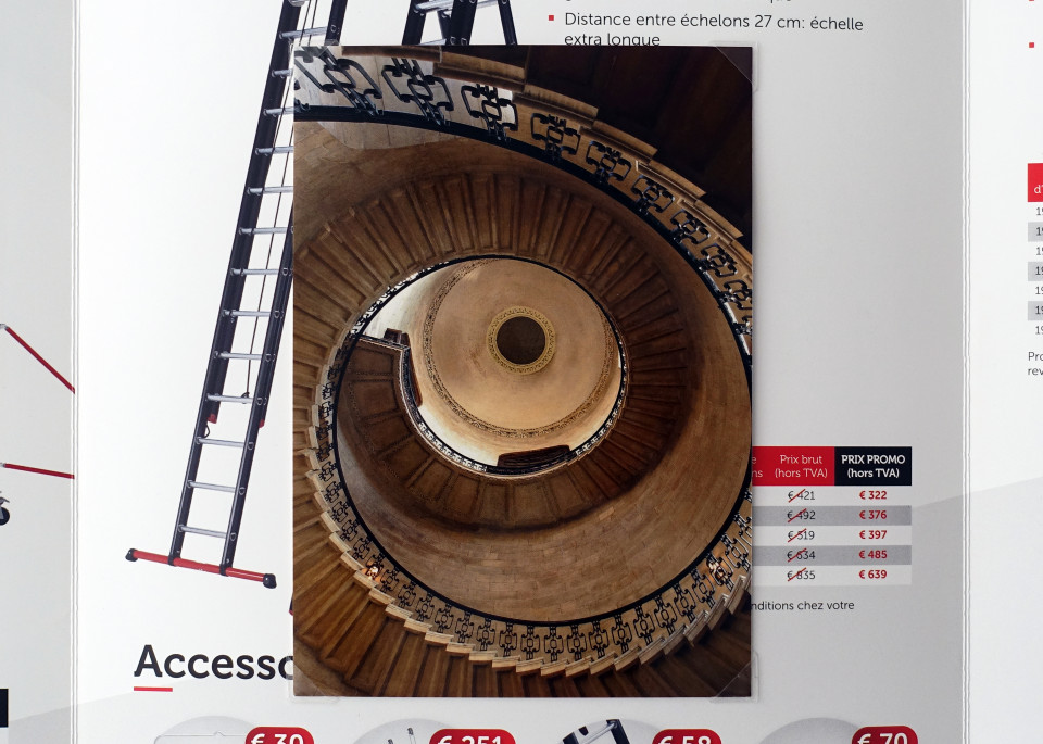 Ce prospectus publicitaire belge de vente d’échelles a été déniché par Oriol Vilanova. Il contient des offres imbattables, des noms drôles et des conseils judicieux mais aussi une carte postale de l’artiste qui non sans humour détourne le propos.