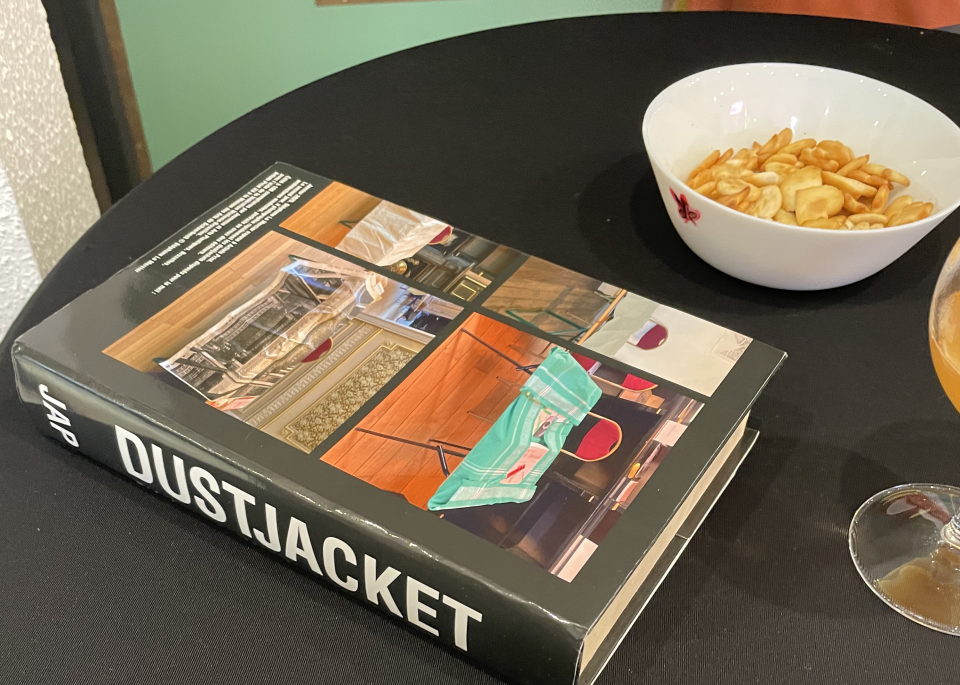 Début 2025, invité à Artists Print, je photographie les tables des éditeurs protégées pour la nuit par différentes qualités de tissus. Après avoir tenté de composer un livre d’artistes de cette documentation, je me rabats sur le geste initial (protéger les livres contre la poussière nocturne) et conçois une jaquette (Dustjacket en anglais), celle d’un livre impublié, d’un volume (dans le sens sculptural du terme) qui ne verra jamais le jour. Ce geste ironique rejoint une production régulière d’ephemera (marque-pages, buvard, ex-libris) débutée en 2020, illustrant mon goût pour l’imprimé modeste et mon intérêt pour sa diffusion publique.