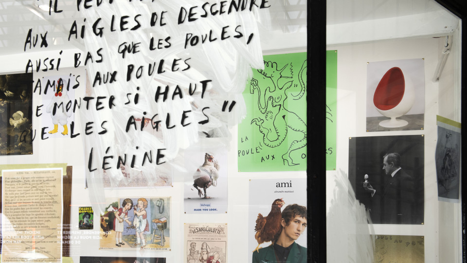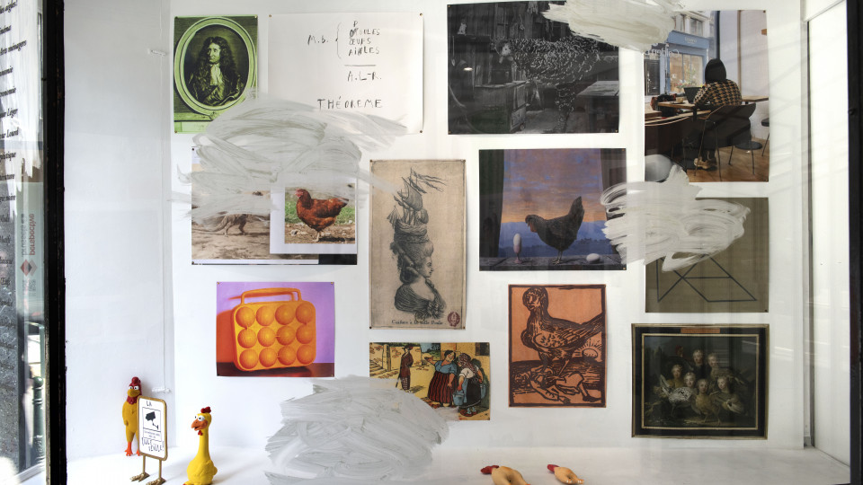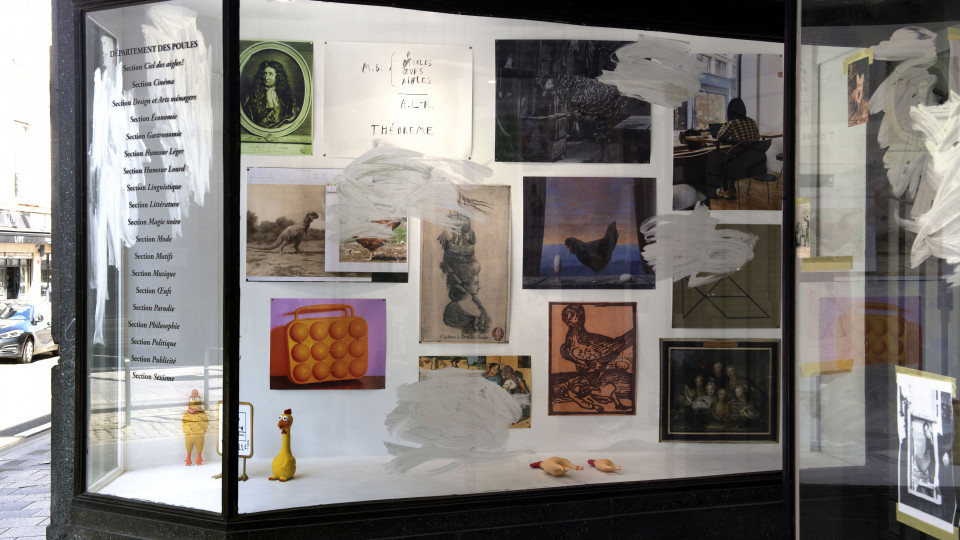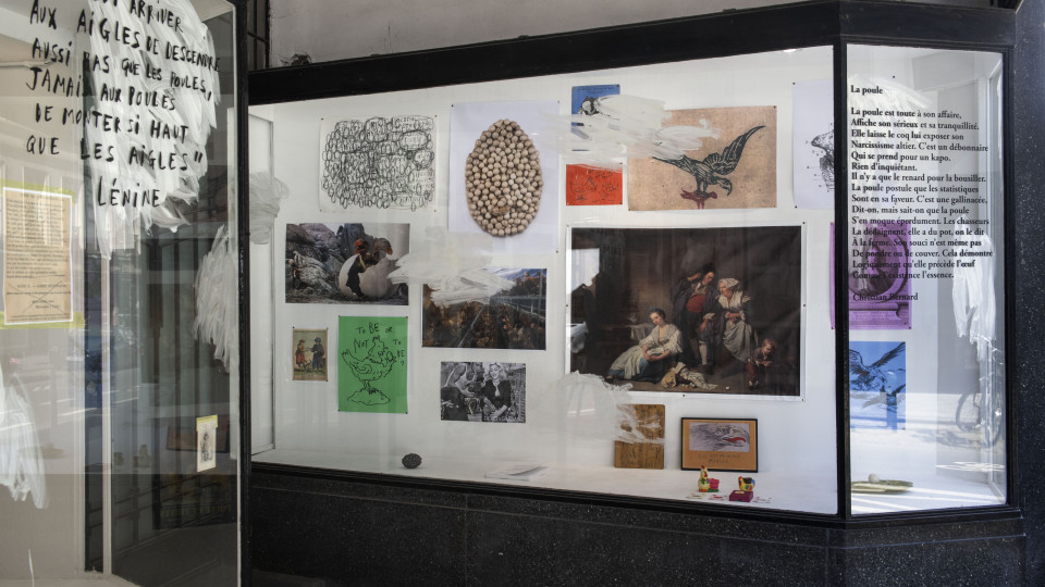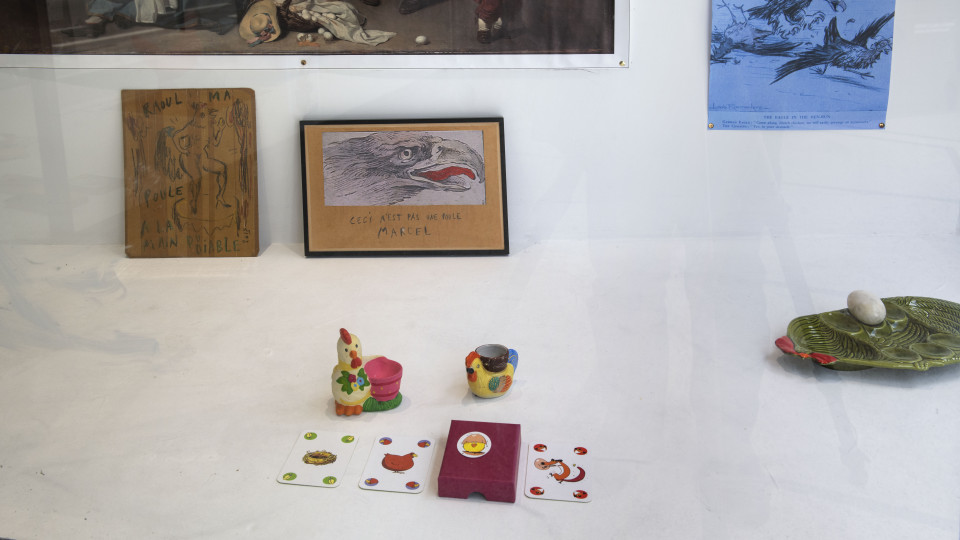 Non, il ne s’agit pas avec le Département des Poules d’une parodie du Département des Aigles, mais d’un échange, ou, disons, d’une conversation à distance dans le temps, avec l’immense Marcel Broodthaers. Le prétexte, une phrase de Lénine : « Il peut arriver aux aigles de descendre aussi bas que les poules, jamais aux poules de monter si haut que les aigles ». Il y a cependant, au-delà de la trouvaille heureuse que constitue cette citation convoquant de fait le rapace glorieux de l’institution muséale fictive créée par Broodthaers, symbole assurément plus riche et exaltant que celui de la volaille terrestre et domestique, une contextualisation fondamentale. Simplifions : comme les dispositifs d’exposition adoptés par Broodthaers, les vitrines du Département des Poules participent d’un jeu de métaphores mis en scène qu’introduit le langage associé à des objets (ou vice versa). Elles peuvent, dans le cas du Département des Poules, revêtir l’avantageuse apparence d’une portée critique, voire politique, mais ne revendiquent le plus souvent que la plate illustration d’une pensée passe-partout ou d’un médiocre calembour, chaque spectateur, c’est son pouvoir, demeurant in fine seul juge de leur valeur et même de leur compréhension. J’ajoute, on s’en sera douté, qu’il n’est pas anodin que ces vitrines soient à Bruxelles, la ville de celui avec qui les règles esthétiques ont durablement pris du plomb dans l’aile.